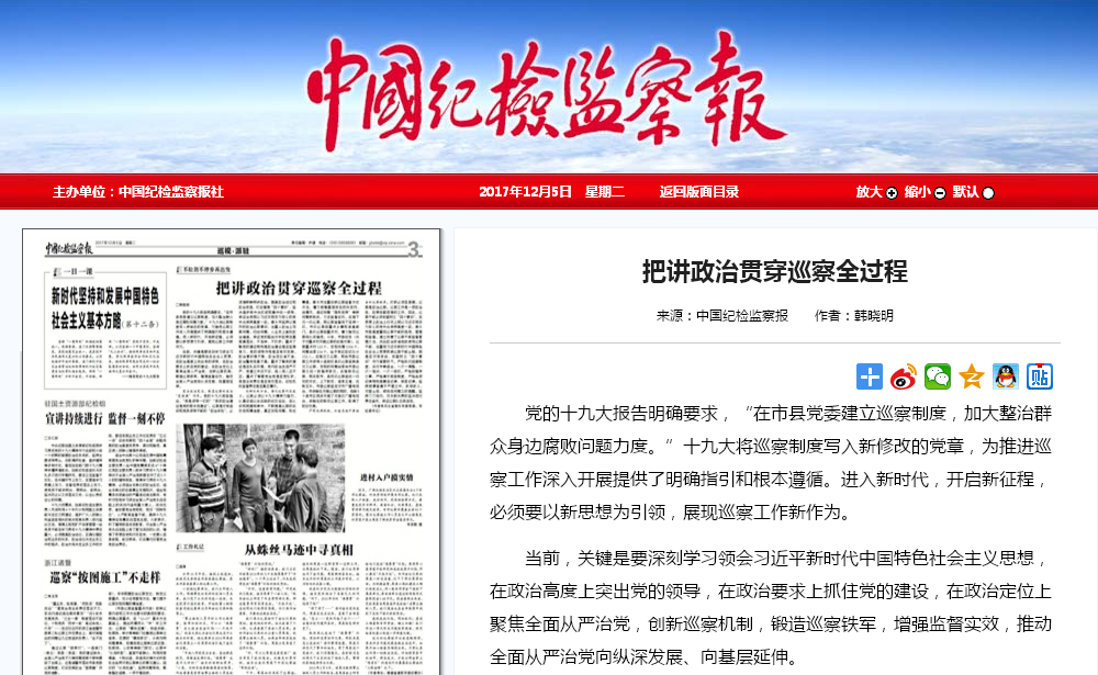 把讲政治贯穿巡察全过程党的十九大报告明确要求,“在市县党委建立巡察制度,加大整治群众身边腐败问题力度。”十九大将巡察制度写入新修改的党章,为推进巡察工作深入开展提供了明确指引和根本遵循。进入新时代,开启新征程,必须要以新思想为引领,展现巡察工作新作为。当前,关键是要深刻学习领会习近平新时代中国特色社会主义思想,在政治高度上突出党的领导,在政治要求上抓住党的建设,在政治定位上聚焦全面从严治党,创新巡察机制,锻造巡察铁军,...